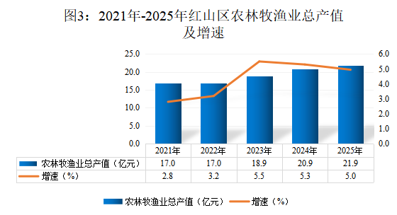 农业基础持续巩固。“十四五”时期,红山区不断加大农业投入,完善农业基础设施建设,农林牧渔业总产值由2020年的15.8亿元增至2025年的21.9亿元,较2020年增长38.6%,按不变价格计算,“十四五”期间年均增长4.4%,农业发展根基愈发坚实。