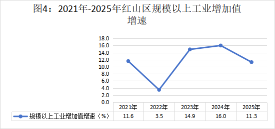发展质效稳步提升。面对宏观经济波动、市场竞争加剧等多重挑战,红山区工业经济彰显强劲发展韧性。“十四五”时期,全部工业增加值由2020年的74.5亿元增至2025年的98.4亿元,较2020年增长32.1%,按不变价计算,年均增长2.8%。全部工业增加值占GDP比重始终保持在25%以上,对经济的贡献率超五成,拉动经济增长1.7个百分点。自2022年5月以来,规上工业连续44个月保持增长,发展态势持续向好;规模以上工业增加值增速由2020年的5.1%提升至2025年的11.3%,按不变价计算,年均增长11.4%,工业高质量发展步伐持续加快。