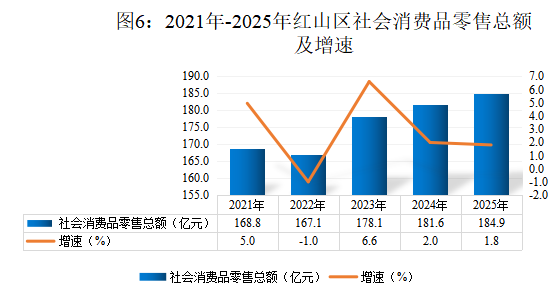 消费活力不断释放。红山区精准落实国家消费品以旧换新、家电家具补贴等促消费政策,同步推出商圈联动促销、夜间经济发展、直播电商扶持等地方特色举措。随着线上线下深度融合,直播带货、社区团购等新兴业态快速兴起,有效带动消费市场提质扩容。“十四五”期间,红山区社会消费品零售总额由2020年的160.8亿元增至2025年的184.9亿元,年均增长2.8%。其中,限额以上单位消费品零售额由2020年的37.2亿元增至2025年的56.6亿元,占社会消费品零售总额的比重由23.1%提升至30.6%,提高7.5个百分点,成为拉动消费增长的重要引擎。