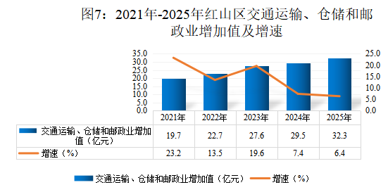交通运输能力显著增强。“十四五”期间,红山区交通运输、仓储和邮政业增加值由2020年15.8亿元增至2025年32.3亿元,较2020年增长104.4%,按不变价计算,年均增长13.8%,占GDP比重由2020年的5.4%提升至8.4%,交通运输保障能力和服务水平持续提升。