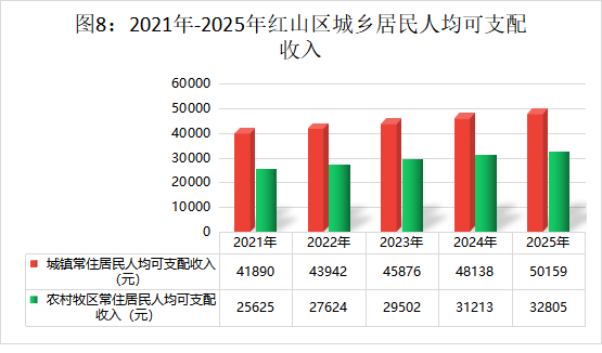 收入水平持续提升。“十四五”期间,红山区全体居民人均可支配收入由2020年的38736元增至2025年的50100元,较2020年增长29.3%,年均增长5.3%。其中,城镇常住居民人均可支配收入由2020年的38959元增至2025年的50159元,增长28.7%,年均增长5.2%;农村常住居民人均可支配收入由2020年的23148元增至2025年的32805元,增长41.7%,年均增长7.2%,农村居民收入增速持续高于城镇,城乡收入增长更趋协调。