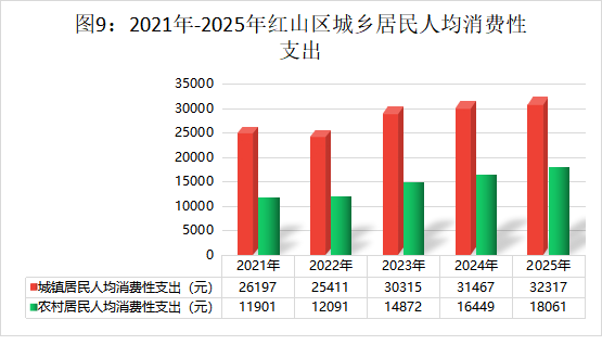 消费潜力充分释放。“十四五”期间,红山区城乡消费潜力协同释放,居民消费能力稳步提升,生活品质持续改善。城镇常住居民人均消费支出由2020年的24808元增至2025年的32317元,较2020年增长30.3%,年均增长5.4%;农村牧区常住居民人均消费支出由2020年的10839元增至2025年的18061元,增长66.6%,年均增长10.8%,农村居民人均消费支出年均增速快于城镇,城乡消费差距进一步缩小,居民生活幸福感持续提升。