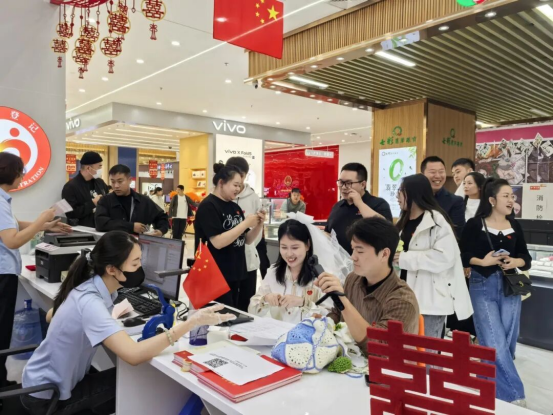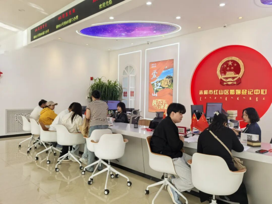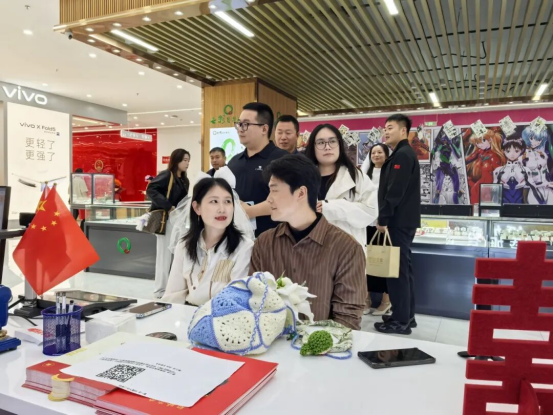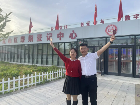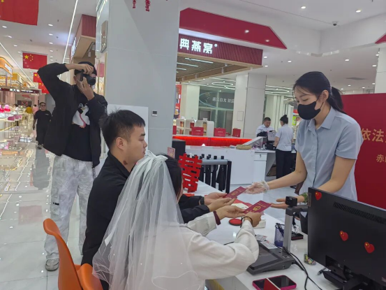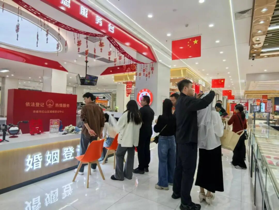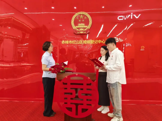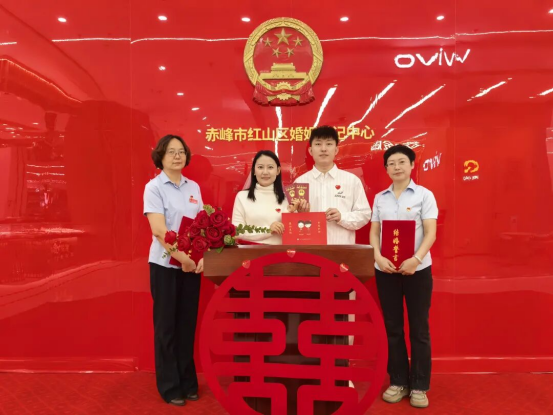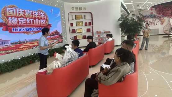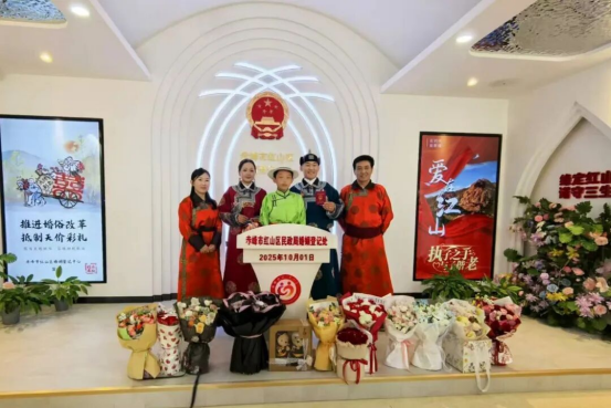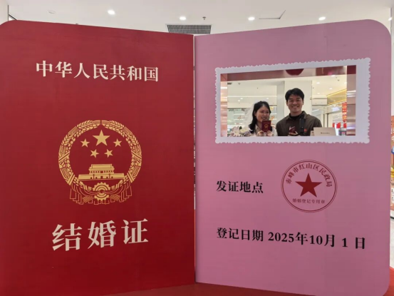 今年国庆,红山区婚姻登记中心打破传统服务模式,将巡回登记点首次延伸至桥北众联时代城商场。现场布置庄重而温馨,国旗飘扬,爱情誓言墙、合影打卡区、纪念相框等细节满满,让新人在轻松愉悦的氛围中完成人生重要仪式。“没想到在商场里也能领证,流程便捷,服务周到,还有集体颁证仪式,太有纪念意义了!”新人郭先生感慨道。这一创新举措不仅提升了政务服务的温度与可及性,更让婚姻登记成为城市节日庆典的一部分,真正实现幸福零距离。