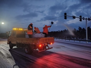 降雪启动后,养护人员加密公路巡查频次,实时监测路况并及时上报,对路面精准抛撒融雪剂,有效抑制路面结冰;同时,聚焦急弯陡坡、长下坡、桥面等易结冰等关键路段,组织人员开展人工铺撒融雪剂和防滑料作业,最大限度降低冰雪天气对交通出行的影响。针对夜间气温更低、结冰风险加剧的情况,进一步加强夜间巡查力度,在重点隐患路段持续铺撒防滑料和融雪剂,全力守护夜间通行安全。