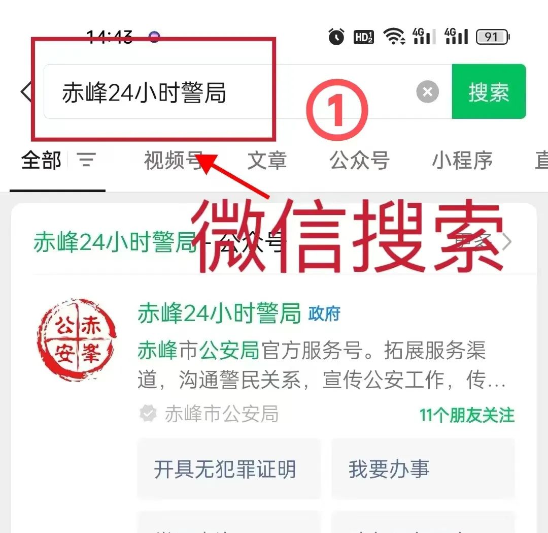 ①打开微信搜索并关注“赤峰24小时警局”微信公众号。