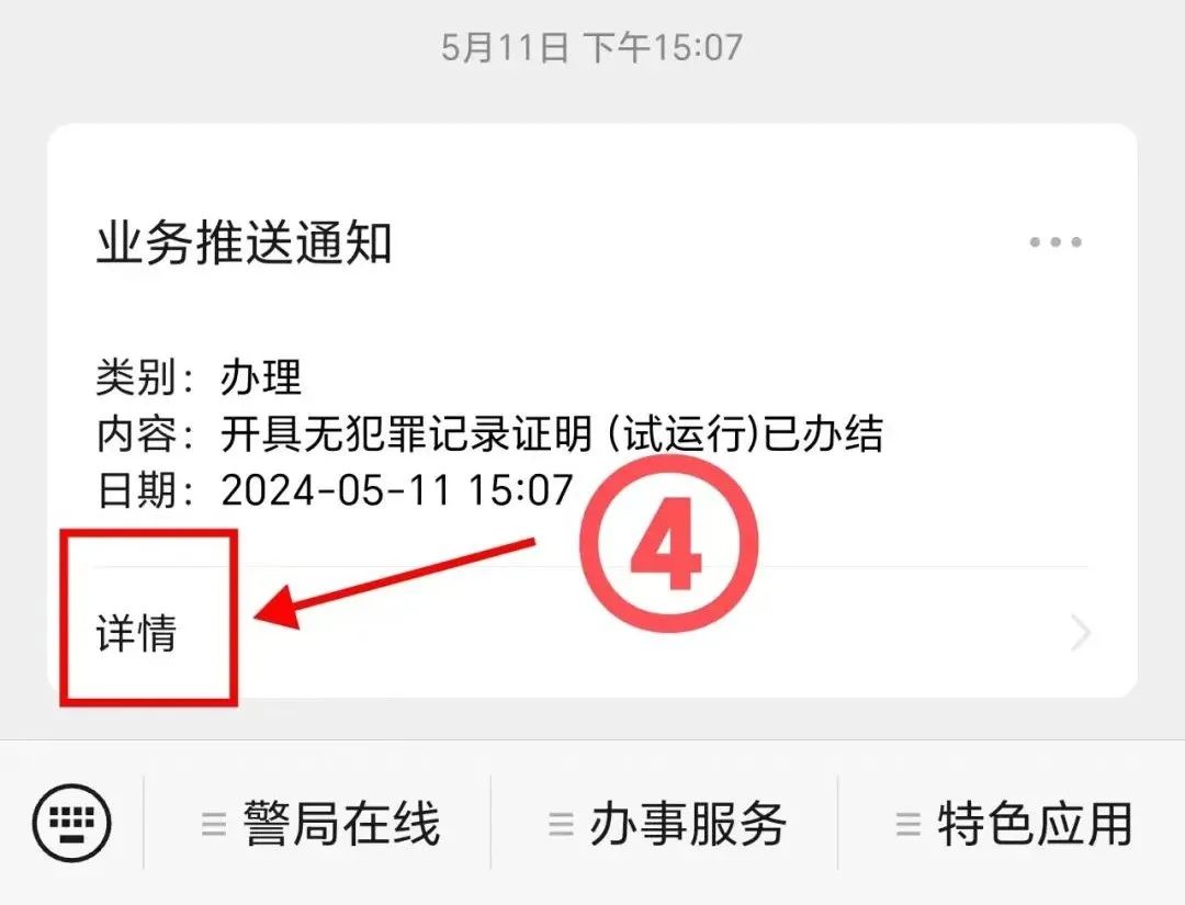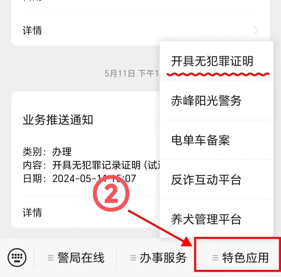 ④经审核符合开具条件的,公安机关将在三个工作日之内,通过“赤峰24小时警局”微信公众号向申请人发送“业务推送通知”,申请人点击“详情”即可查看办件详情。