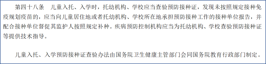 按《中华人民共和国疫苗管理法》第四十八条和国家卫生健康委员会、教育部2021年《关于印发儿童入托、入学预防接种证查验办法的通知》的要求:托育机构、幼儿园、学校在新入托入学、转学和插班,须查验预防接种评估结果。