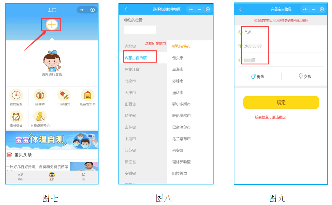 ②选择儿童信息所在地市(图八),在弹出的宝贝信息页面,不要改动任何信息,直接点击“确定”完成宝宝信息的绑定(图九)。