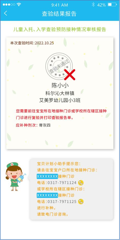 查验未通过,需要前往接种门诊打印查验报告单并扣章。