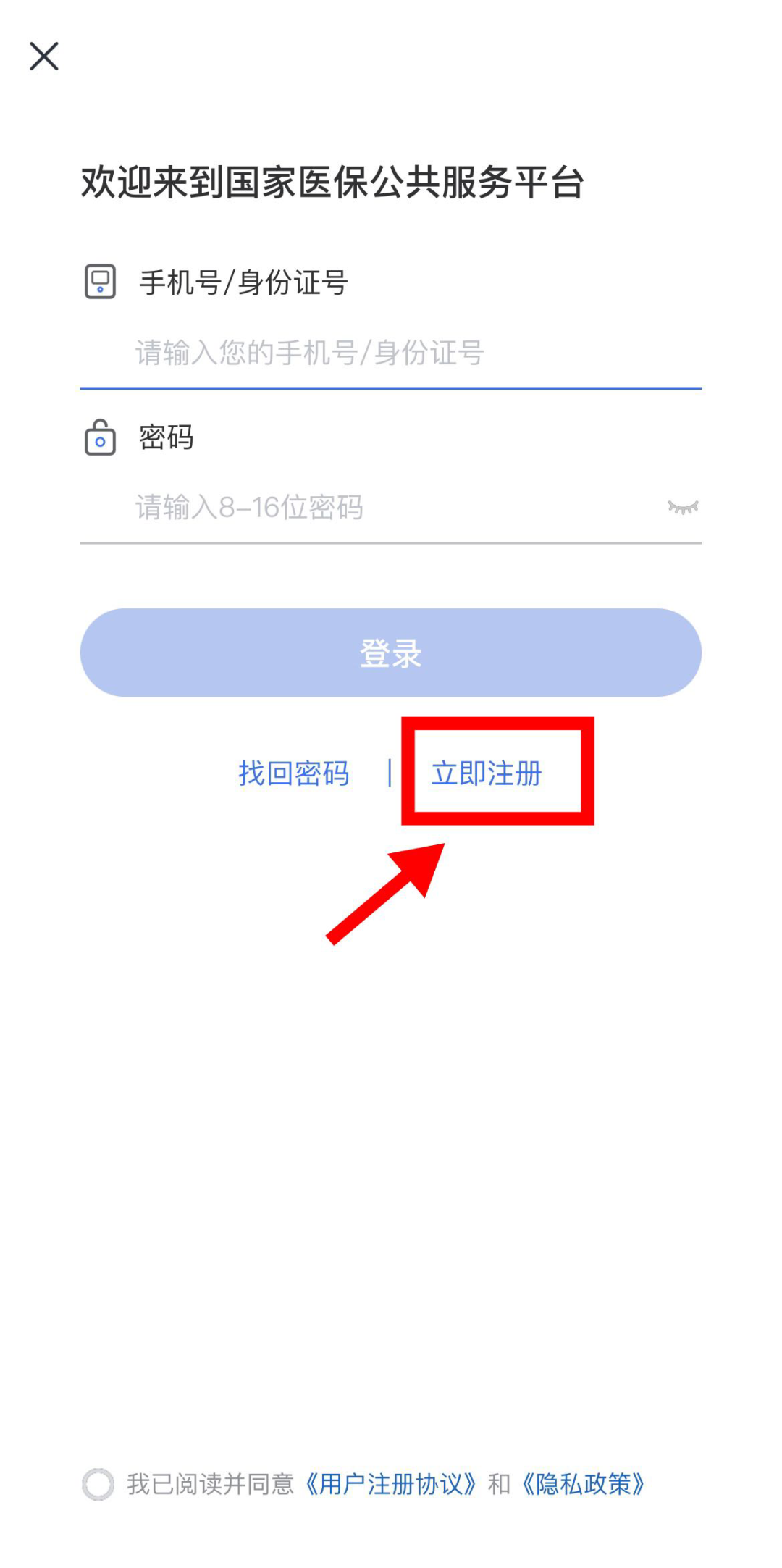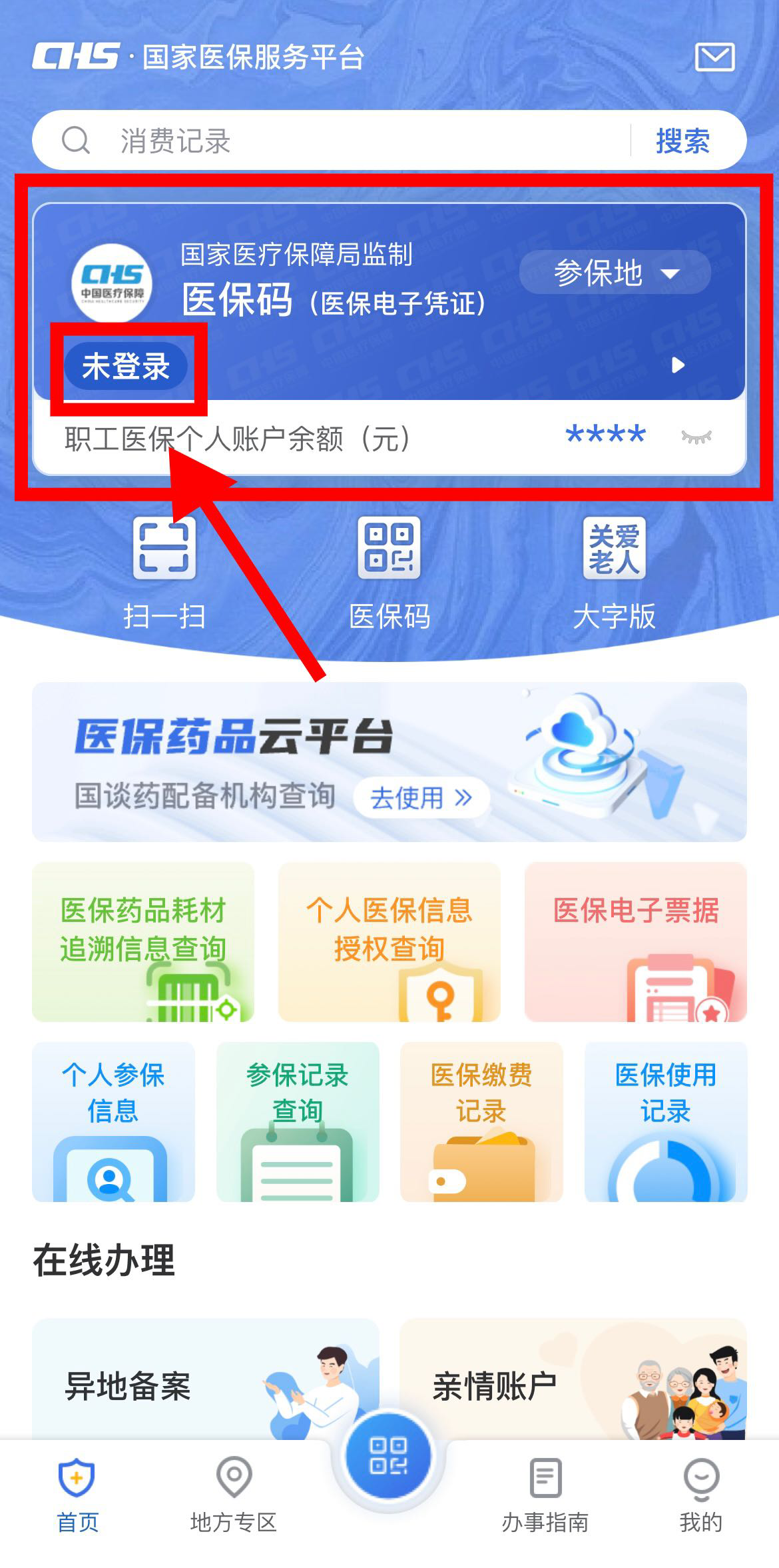 打开国家医保服务平台APP,若是显示未登录,点击未登录登录即可登录(如果是首次登录,点击立即注册),若是已登录,忽略此步骤: