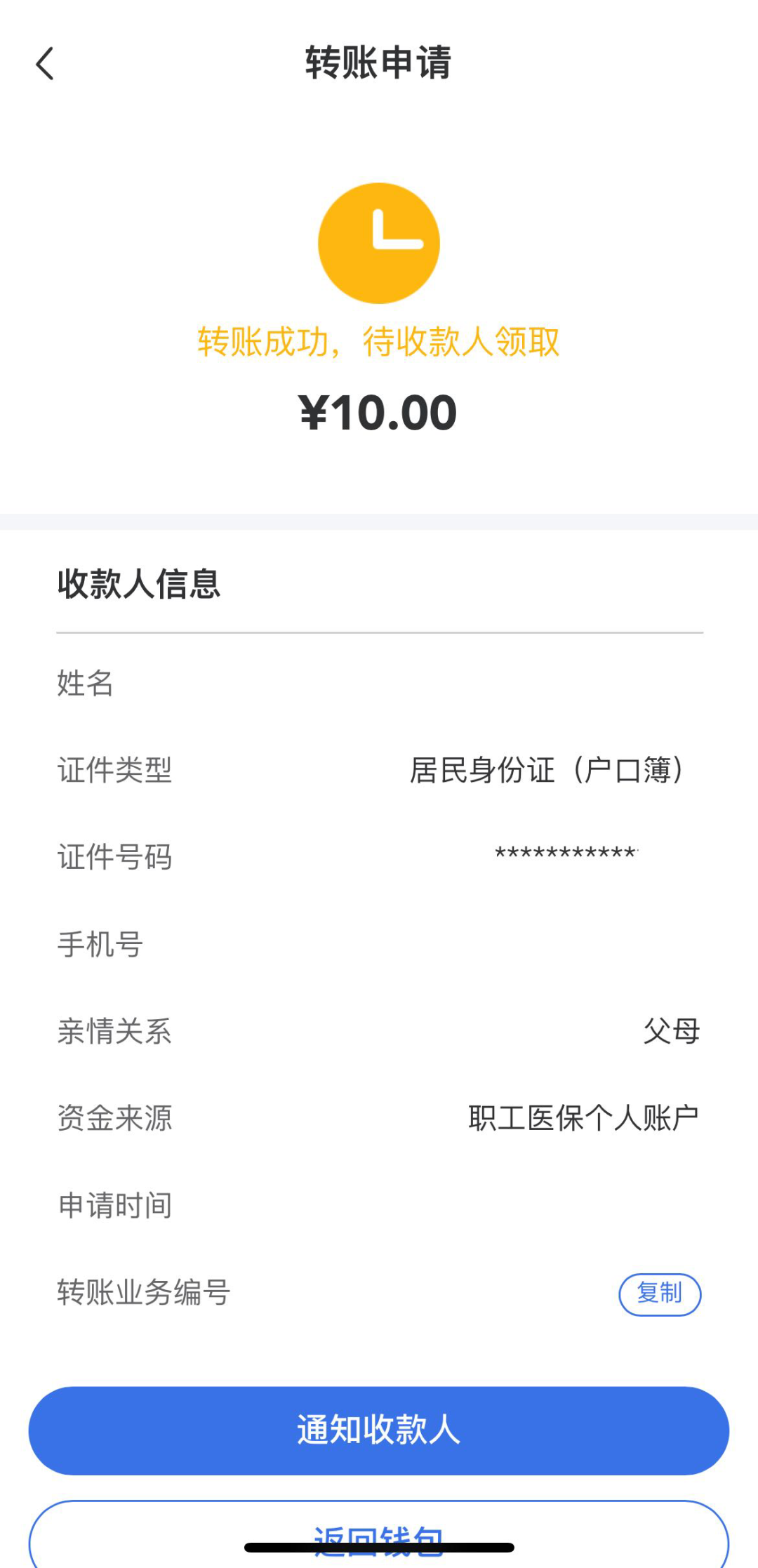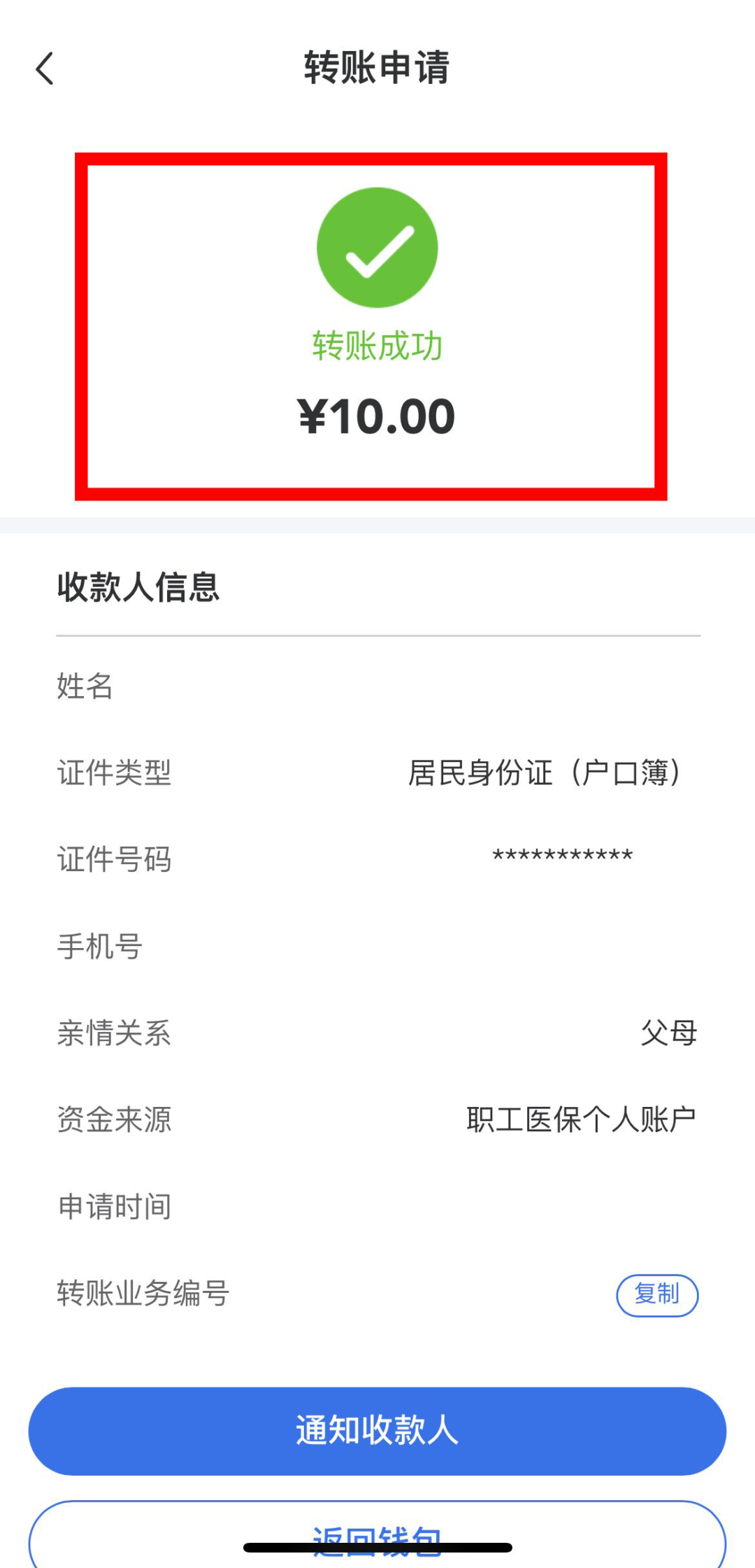 3.授权人转账成功后,被转账人可在自己的医保钱包界面查询钱包余额及转账记录。