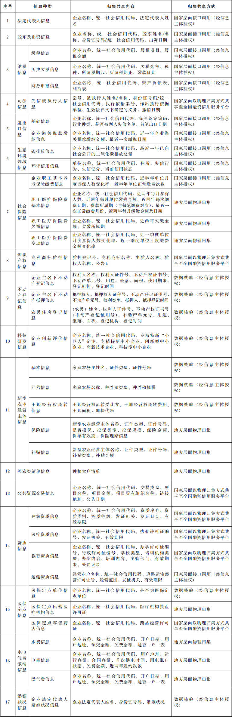 (四)明确信用信息归集共享范围。根据金融机构对信用信息的实际需求,进一步扩大信用信息归集共享范围,将企业主要人员信息、各类资质信息、进出口信息等纳入信用信息归集共享清单(见附件),国家发展改革委牵头适时对清单进行更新。各地区要充分发挥地方融资信用服务平台作用,进一步破除数据壁垒,依法依规加大清单外信用信息归集共享力度,结合本地区实际编制省级信用信息归集共享清单,有效拓展数据归集共享的广度与深度。