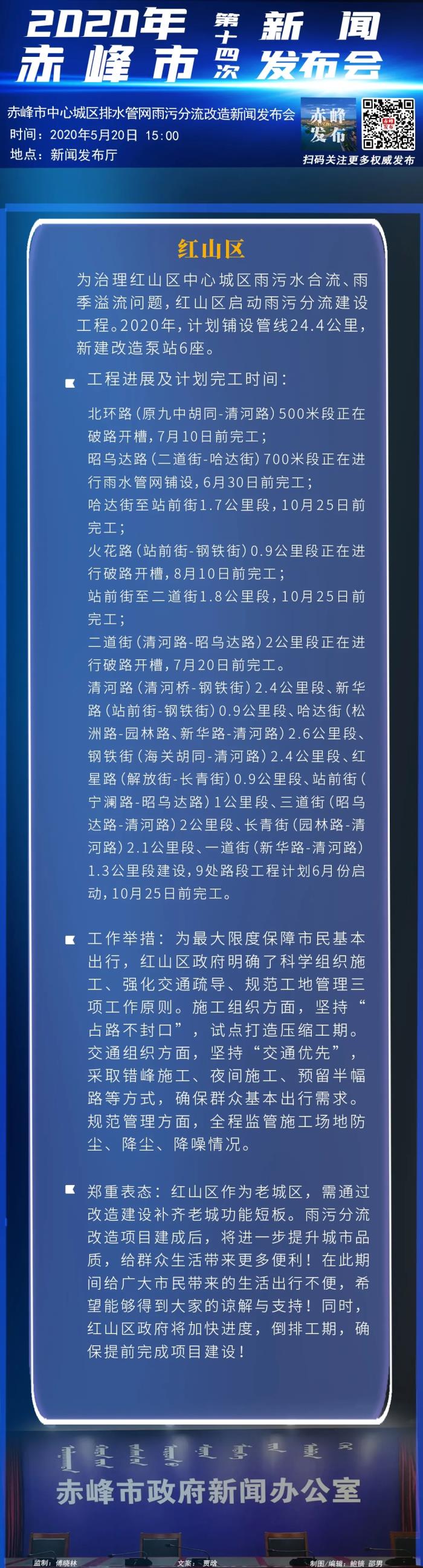 红山区中心城区排水系统建成年代较早,大部分为雨污水合流,污水直排排入截流干管,雨季溢流至河道内,容易形成黑臭水体。针对上述问题,结合城区易涝点专项整治工作,2019年红山区计划投资7.7亿元,启动雨污分流建设工程,铺设管网35.4公里,新建改造雨水泵站6座,2019年已铺设雨水管线11公里。2020年,计划铺设管线24.4公里、新建改造泵站6座。目前,解放街(昭乌达路—红星路)1.2公里段已完成雨水管线铺设和路面恢复。北环路(原九中胡同-清河路)500米段正在破路开槽,7月10日前完工;昭乌达路(二道街-哈达街)700米段正在进行雨水管网铺设,6月30日前完工,哈达街至站前街1.7公里段,10月25日前完工;火花路(站前街-钢铁街)0.9公里段正在进行破路开槽,8月10日前完工,站前街至二道街1.8公里段,10月25日前完工;二道街(清河路-昭乌达路)2公里段正在进行破路开槽,7月20日前完工。