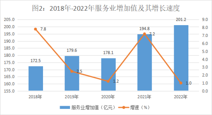 全年服务业增加值201.2亿元,比上年增长1.0%。其中,批发和零售业增加值57.4亿元,增长8.8%;交通运输、仓储及邮政业增加值12.9亿元,增长5.0%;住宿和餐饮业增加值5.3亿元,下降16.4%;金融业增加值23.8亿元,下降0.7%;房地产业增加值28.5亿元,下降5.9%。全年规模以上服务业企业营业收入比上年增长2.2%。