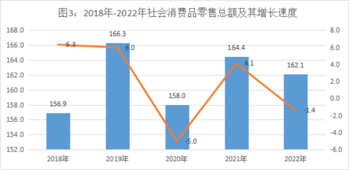全年社会消费品零售总额162.1亿元,比上年下降1.4%。按经营地统计,城镇消费品零售额162.1亿元,下降1.4%。按消费类型统计,商品零售额154亿元,增长1.6%;餐饮收入8.1亿元,下降1.6%。