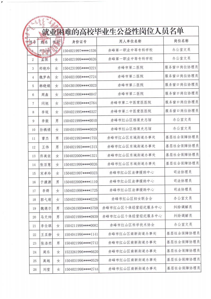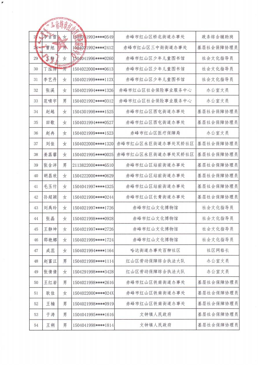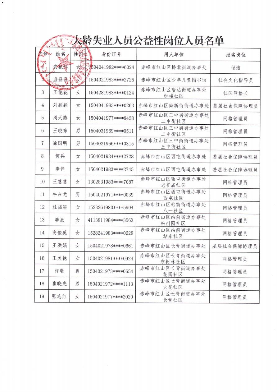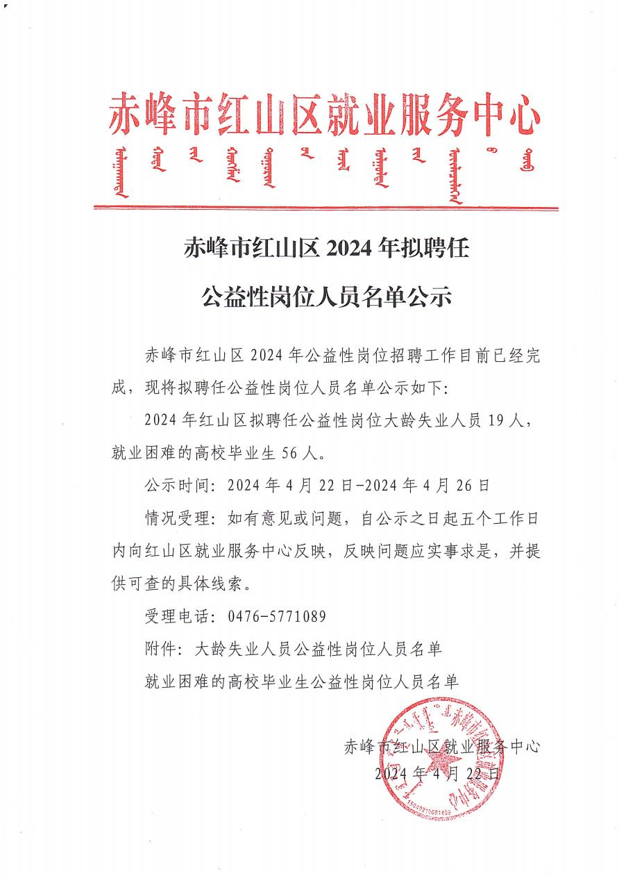 赤峰市红山区2024年拟聘任公益性岗位人员名单公示