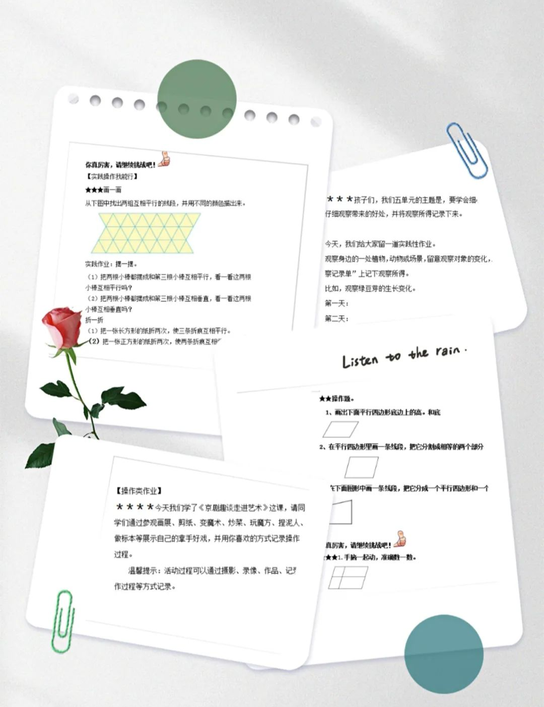 2、基于个性化需求丰富作业形式。结合单元目标,设计不同类型作业,既要有题型灵活多样的书面作业,又要有学科特色鲜明的实践类、探究类、操作类、跨学科融合类等多样化作业设计,并且多以开放式的问题呈现,满足学生的个性化需求,让学生能主动参与、乐于探究。