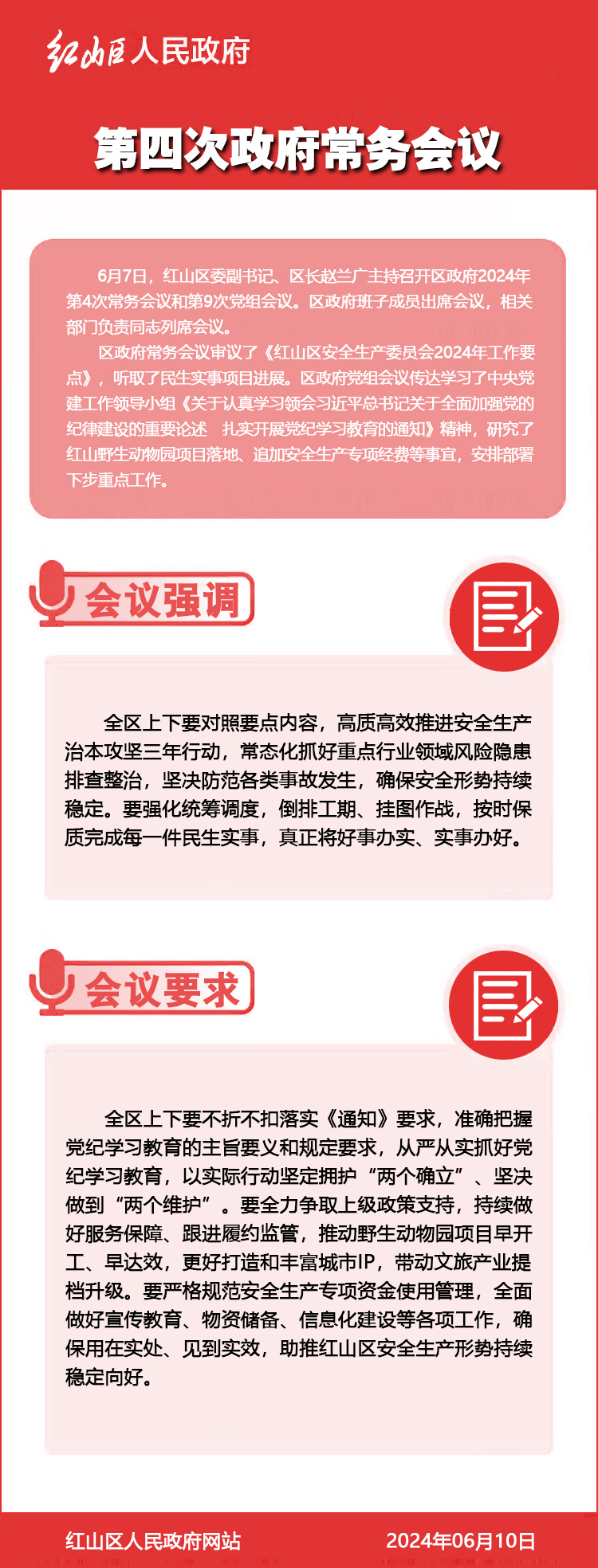 6月7日,红山区委副书记、区长赵兰广主持召开区政府2024年第4次常务会议和第9次党组会议。区政府班子成员出席会议,相关部门负责同志列席会议。