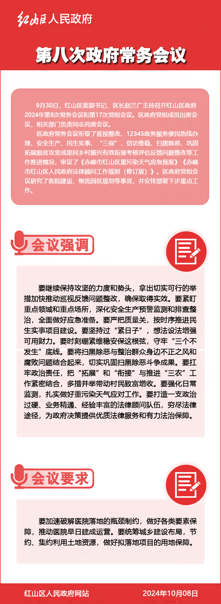 9月30日,红山区委副书记、区长赵兰广主持召开红山区政府2024年第8次常务会议和第17次党组会议。区政府党组成员出席会议,相关部门负责同志列席会议。