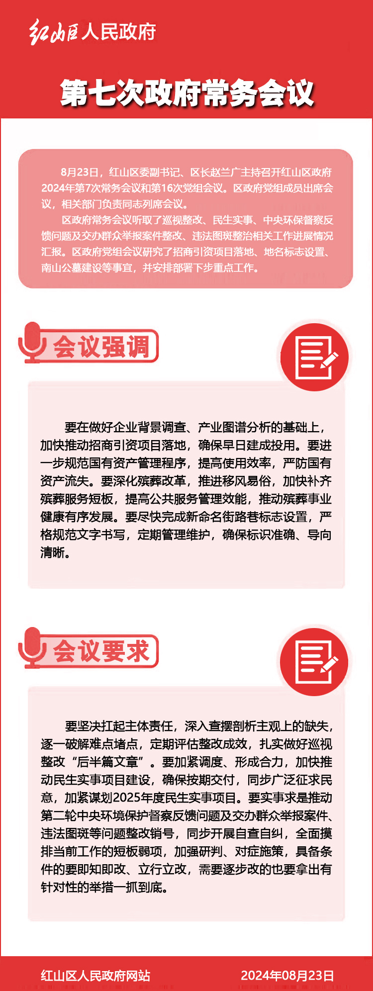8月23日,红山区委副书记、区长赵兰广主持召开红山区政府2024年第7次常务会议和第16次党组会议。区政府党组成员出席会议,相关部门负责同志列席会议。