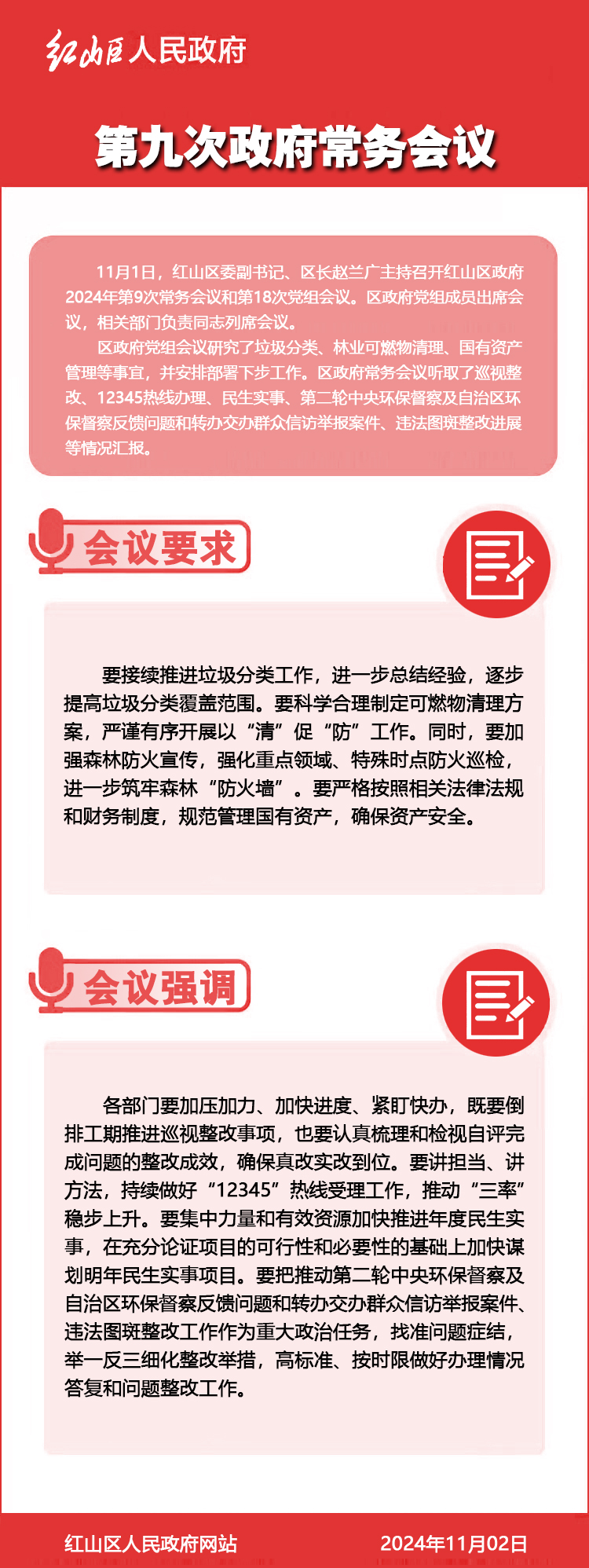 11月1日,红山区委副书记、区长赵兰广主持召开红山区政府2024年第9次常务会议和第18次党组会议。区政府党组成员出席会议,相关部门负责同志列席会议。