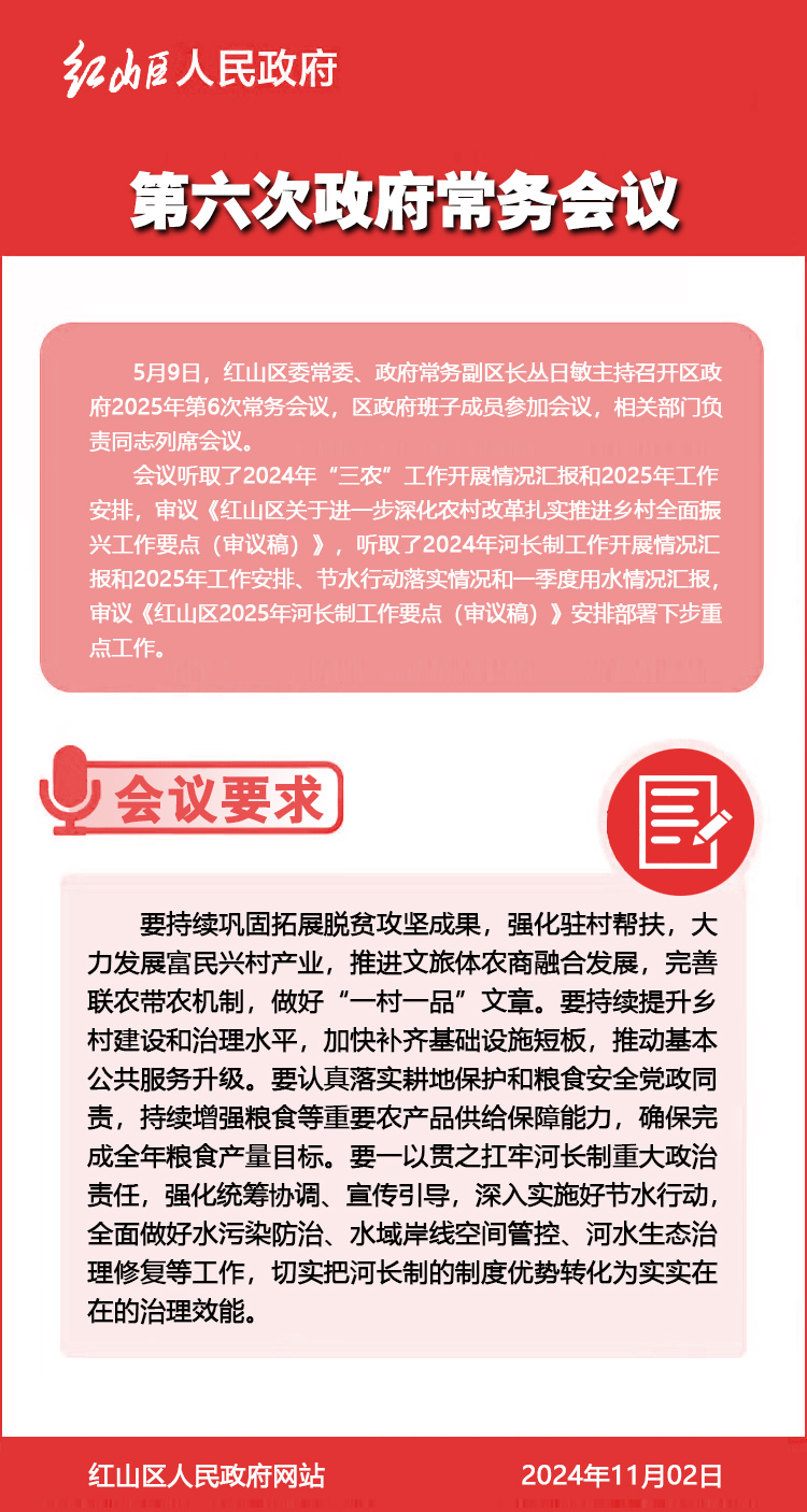 会议要求,要持续巩固拓展脱贫攻坚成果,强化驻村帮扶,大力发展富民兴村产业,推进文旅体农商融合发展,完善联农带农机制,做好“一村一品”文章。要持续提升乡村建设和治理水平,加快补齐基础设施短板,推动基本公共服务升级。要认真落实耕地保护和粮食安全党政同责,持续增强粮食等重要农产品供给保障能力,确保完成全年粮食产量目标。要一以贯之扛牢河长制重大政治责任,强化统筹协调、宣传引导,深入实施好节水行动,全面做好水污染防治、水域岸线空间管控、河水生态治理修复等工作,切实把河长制的制度优势转化为实实在在的治理效能。