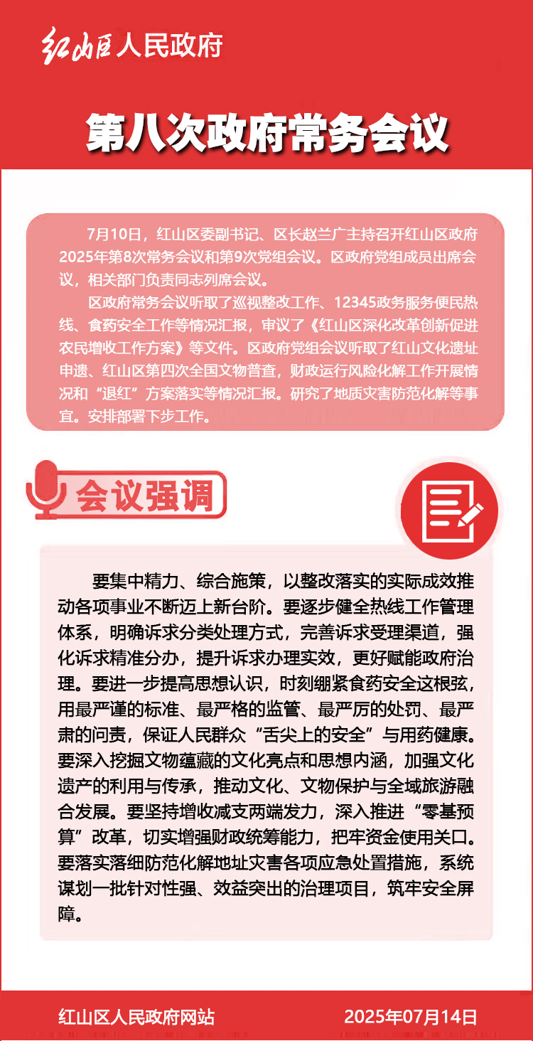 7月10日,红山区委副书记、区长赵兰广主持召开红山区政府2025年第8次常务会议和第9次党组会议。区政府党组成员出席会议,相关部门负责同志列席会议。